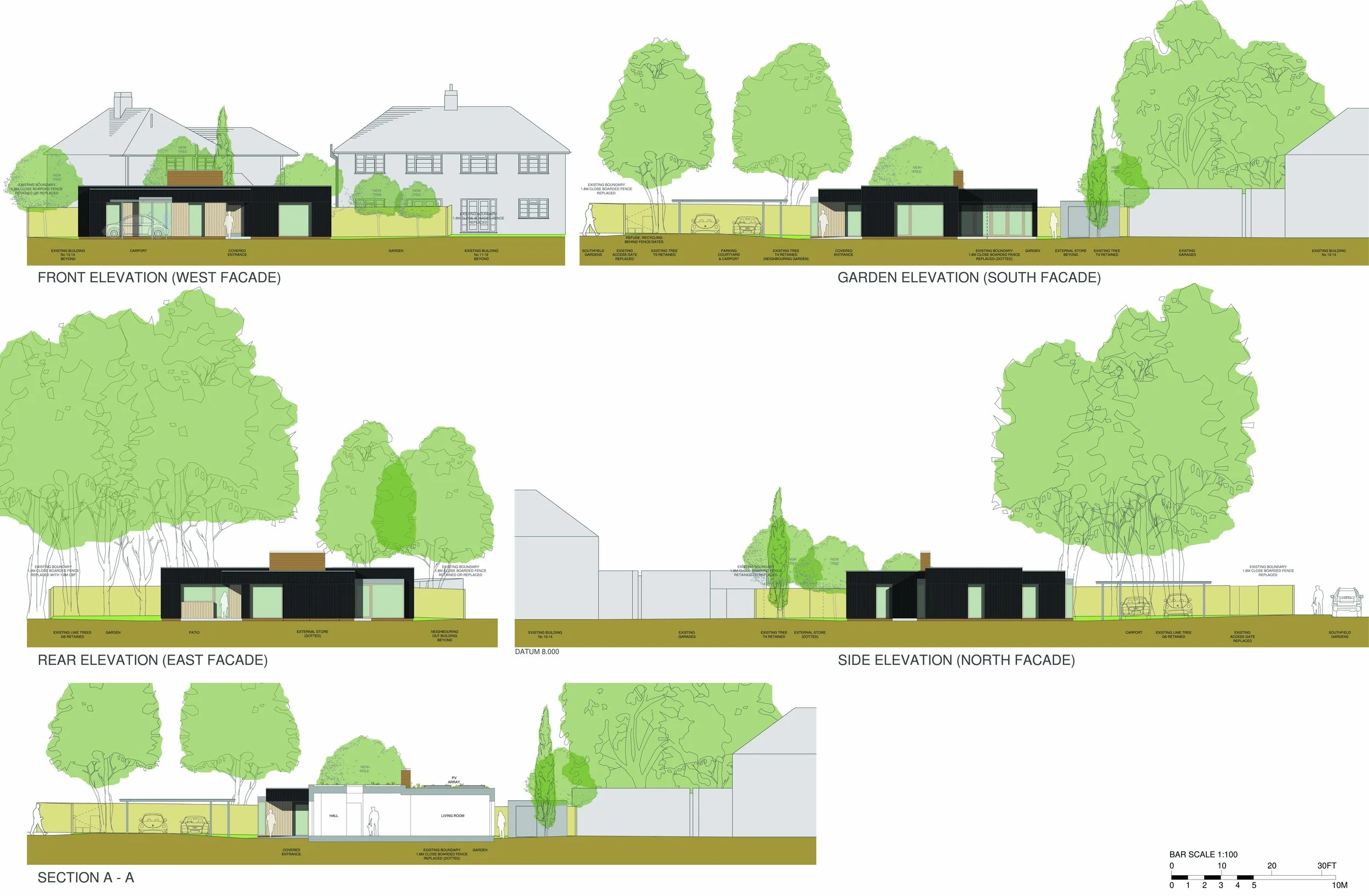 A new single-storey, three-bedroom house on extensive and underutilized gardens. The designs include an extensive flat green roof which minimises the visual impact of the design as it screen by perimeter fencing, as well as existing and proposed trees.